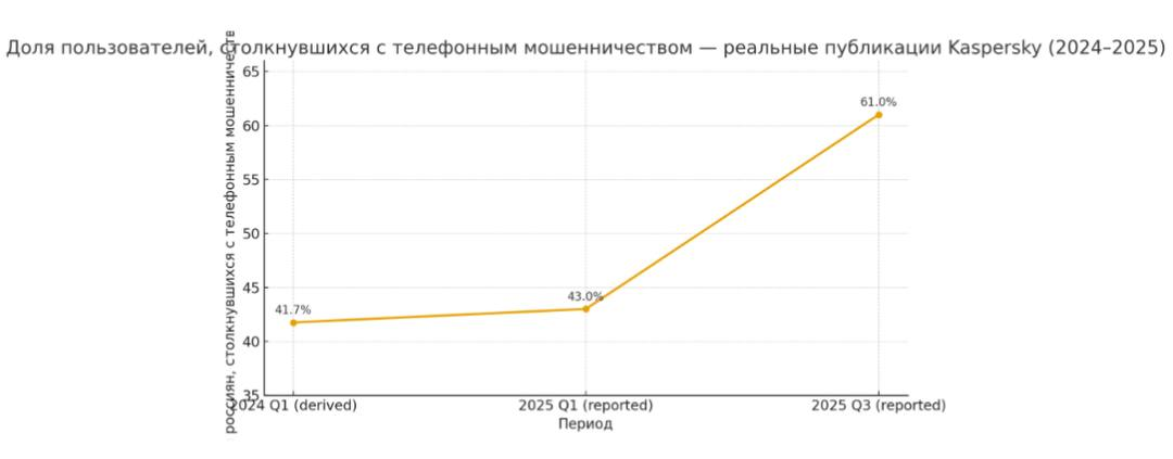 Доля российских пользователей, столкнувшихся с классическими звонками с подозрением на мошенничество… составила 43% (данные Kaspersky Who Calls за янв–март 2025).
