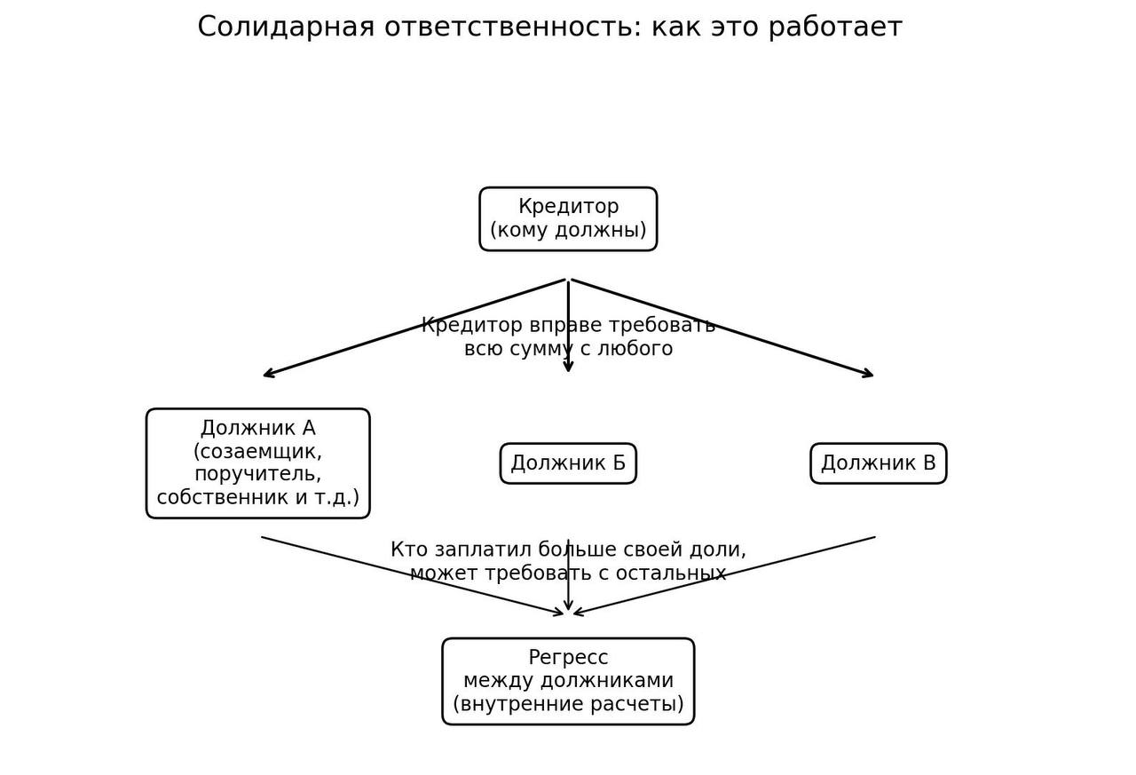 В юридической практике часто встречается термин «солидарная ответственность». Он применяется в гражданском праве, когда за одно обязательство отвечают сразу несколько лиц. Главное отличие — кредитор может взыскать всю сумму долга с любого из должников, а не только «его часть». Это когда один долг висит на нескольких людях, и кредитор (банк, потерпевший, контрагент) вправе потребовать всю сумму с любого из них, хоть с самого платежеспособного, хоть с самого “случайно подписавшего”. Это не “каждый платит свою часть”, а “каждый потенциально платит все”, пока долг не закрыт полностью. КонсультантПлюс