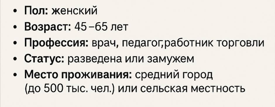 Преимущественно женщины (60–65 % обращений), абсолютно разного статуса: разведенные, замужем, одиночки, в декрете.Что интересно, потенциальные жертвы живут в средних городах до 500 тыс.население., пригороды либо сельская местность. Большие города тоже страдают, но реже — уровень цифровой грамотности выше. По профессии эти женщины работают чаще всего в сфере с высокой нагрузкой: образование, медицина, торговля, бюджетная сфера, а также находятся в декрете по уходу за ребенком. Две основные возрастные группы разделились по целям: