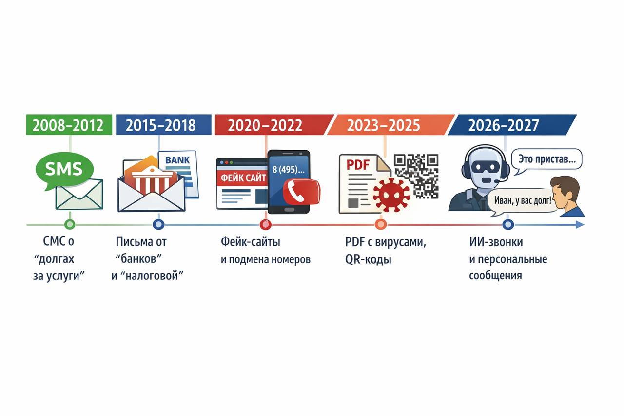 Выше на таймлайне хорошо видно, как менялись инструменты обмана и почему сегодня ложное уведомление о задолженности может выглядеть почти неотличимо от настоящего. Это не случайность и не разовая вспышка, а системная эволюция схемы, которая продолжается до сих пор и, судя по трендам, далека от финала.