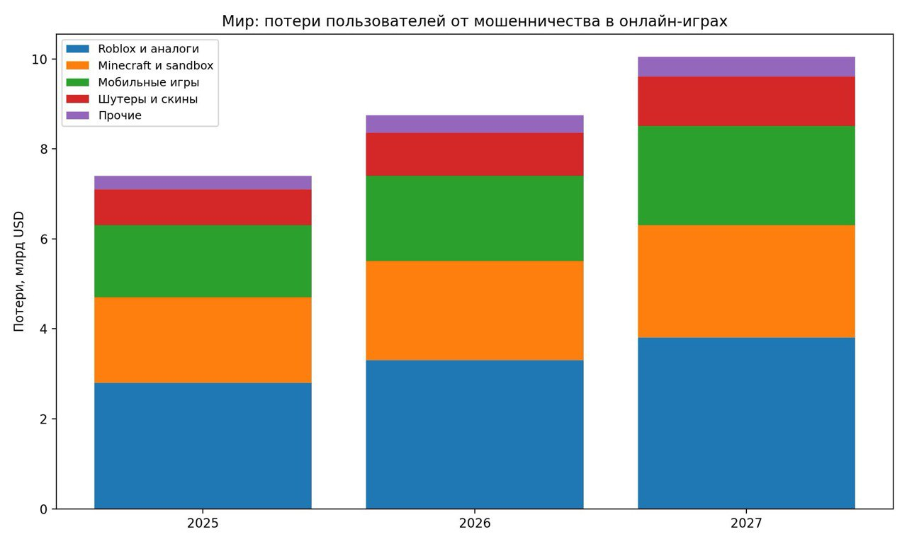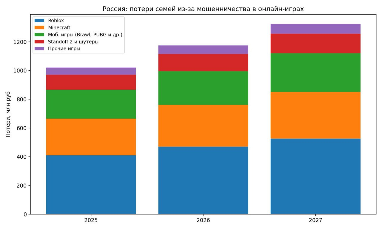 Этот график показывает не всплеск и не панику. Он показывает привычку. Мошенники встроились в игровую среду, а деньги у семей уходят регулярно. Оценка за 2025 год основана на открытых данных (около 850 млн рублей за январь–октябрь с приведением к году). Прогноз на 2026 и 2027 годы строится на простых фактах: дети проводят в играх больше времени, чаты никуда не делись, а схемы становятся проще и наглее.