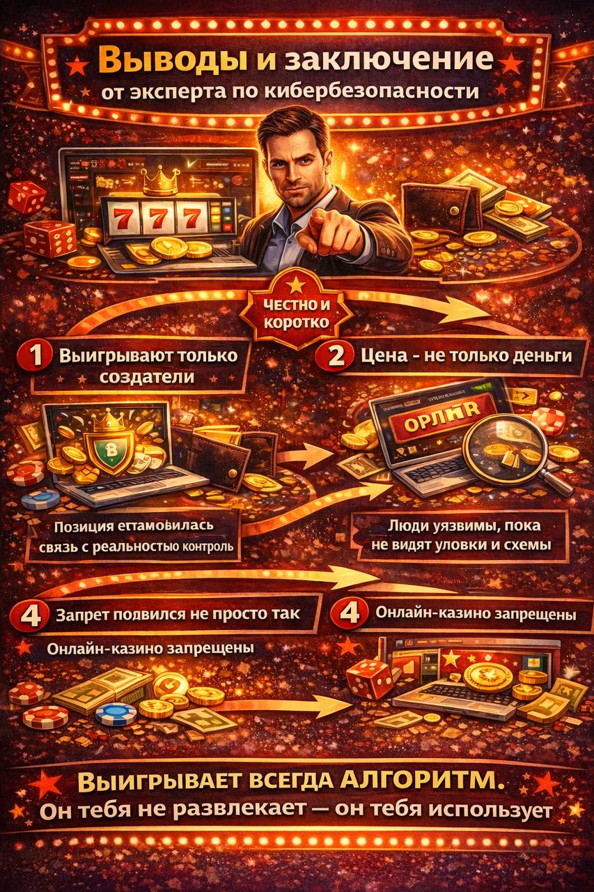 Самая большая опасность даже не в деньгах. Деньги можно потерять и заработать снова. Гораздо хуже потерять ощущение реальности, когда очередной депозит кажется логичным шагом, а не тревожным сигналом. Запрет онлайн-казино в России существует не для галочки. Это попытка защитить людей от механики, которая почти всегда заканчивается одинаково. Выигрывают только те, кто написал алгоритм.