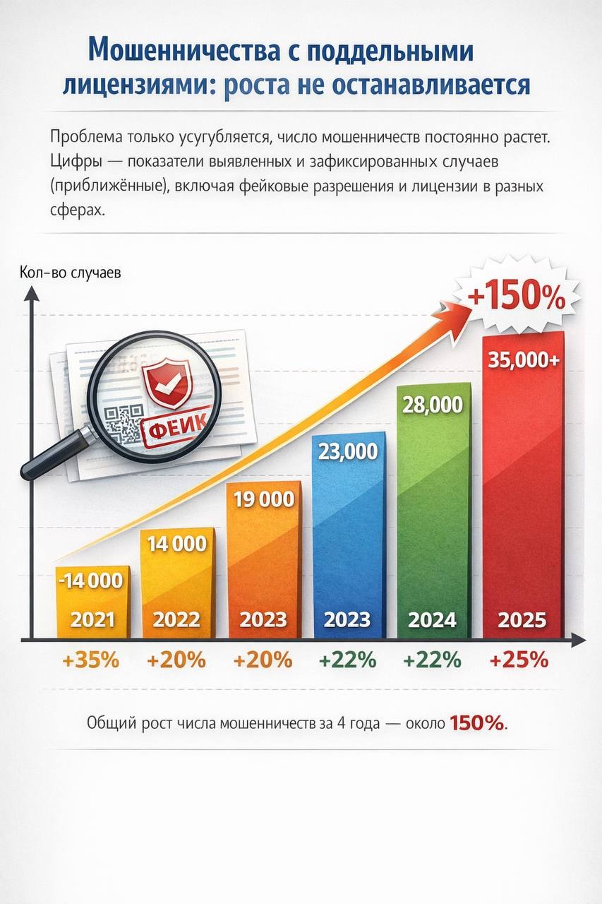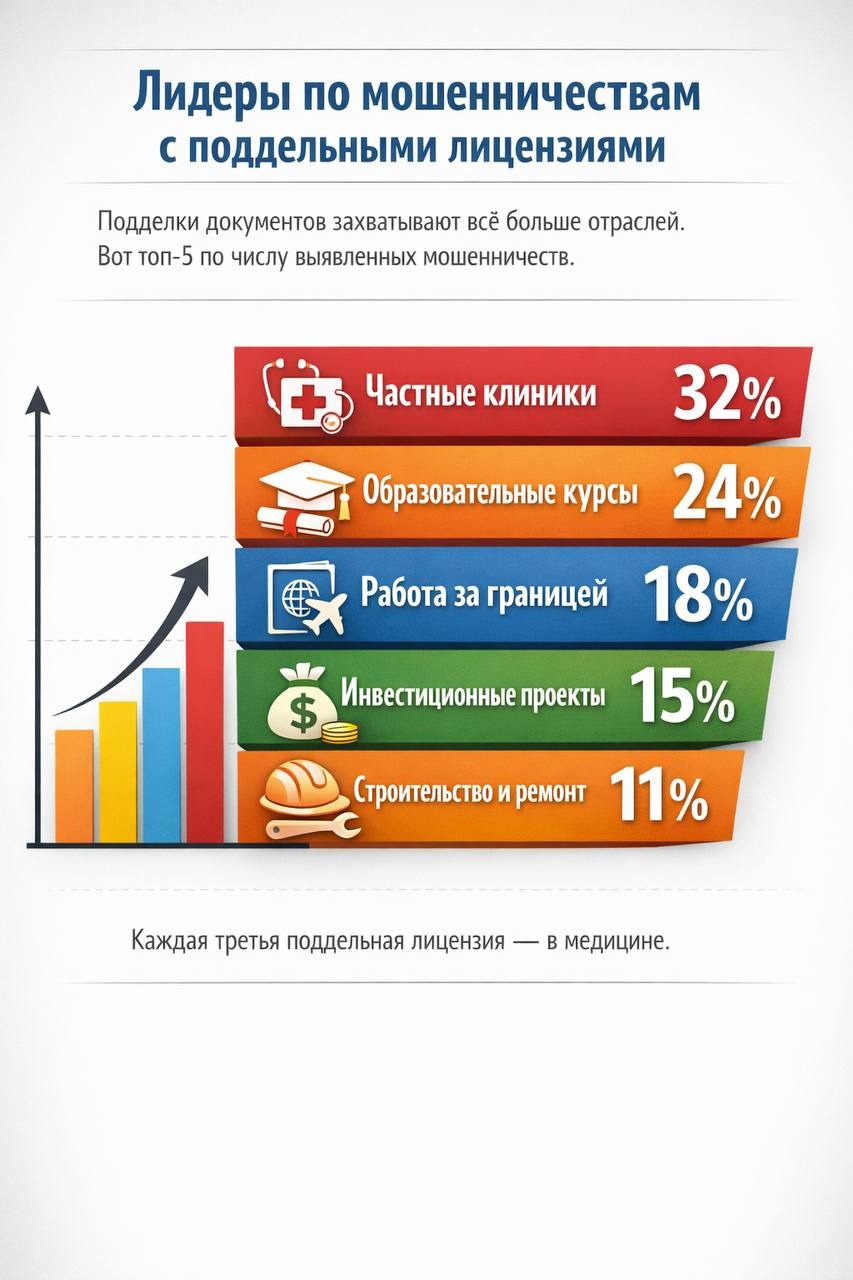 Каждая третья история с поддельной лицензией приходится на частные клиники и медицинские услуги. Там, где страх за здоровье отключает критическое мышление быстрее всего. Люди верят бумаге, потому что хотят верить.