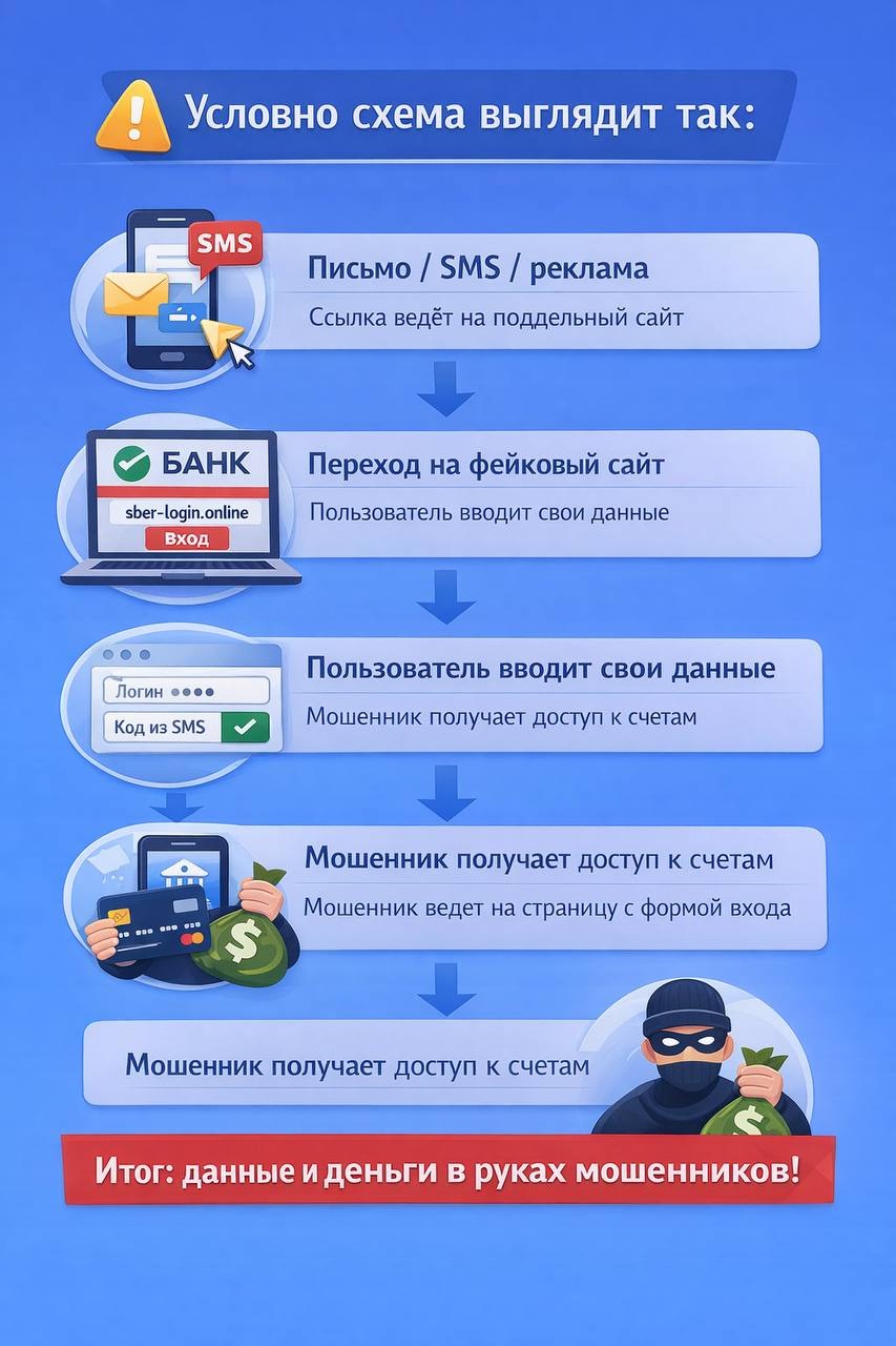 Поддельный сайт — это веб-страница, созданная мошенниками так, чтобы казаться официальным сайтом банка. Дизайн, логотип, тексты — всё выглядит как настоящий сайт, но адрес (URL) может быть чуть другим, и цель у такого ресурса одна: забрать логины, пароли, коды из СМС, CVV и реквизиты карт.