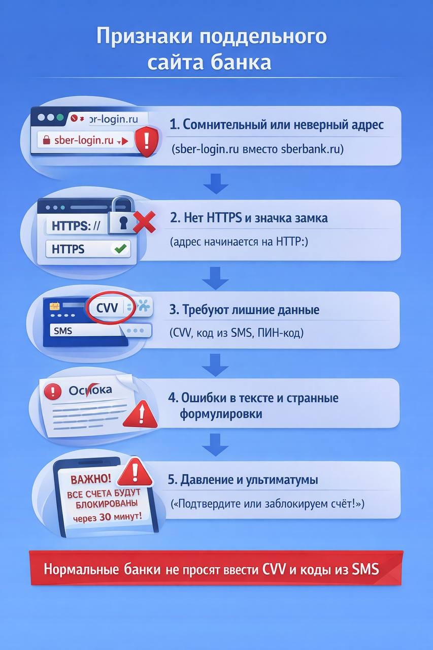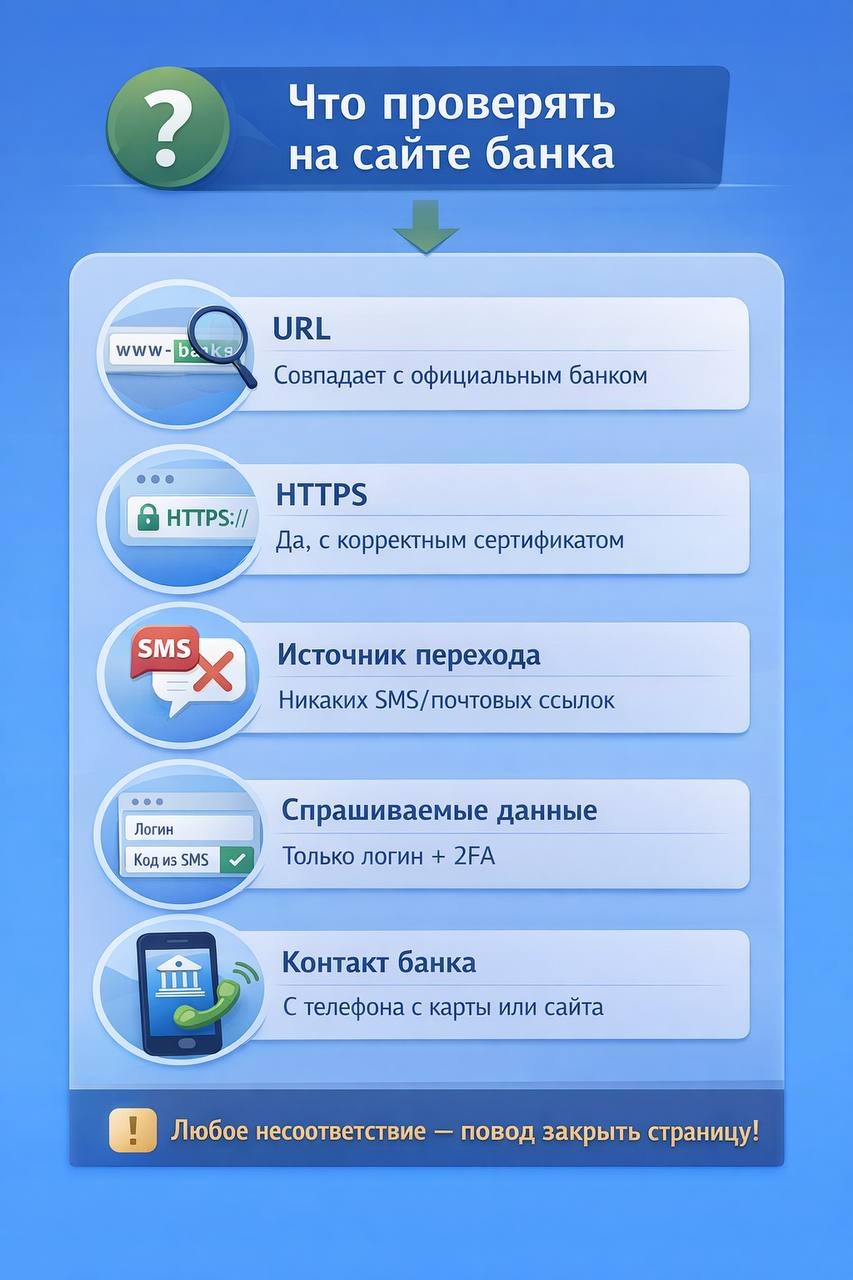 ☐ Я набрал адрес вручную, а не по ссылке. ☐ Передо мной официальный домен банка. ☐ Есть замок HTTPS. ☐ Сайт не просит CVV, пин-коды, SMS-коды без необходимости. ☐ Я не поддался давлению вроде «срочно решите проблему».