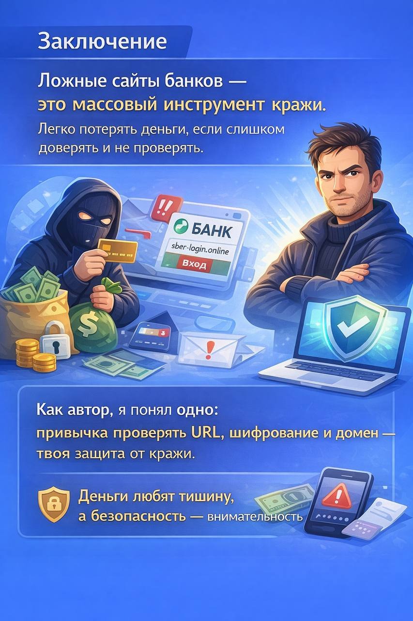 За годы работы я видел сотни случаев, когда люди теряли деньги не потому, что были наивными, а потому что мошенники научились идеально копировать доверие. Поддельные сайты банков — это не редкость и не экзотика, а массовый инструмент кражи. Единственное, что реально защищает, привычка проверять источник и не торопиться. Деньги любят тишину, а безопасность — внимательность.