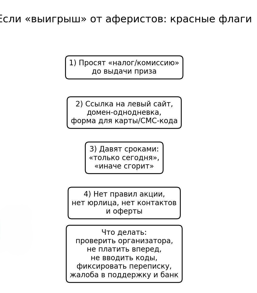 1. Просят оплатить налог или комиссию заранее В реальной жизни налог удерживают при выплате или вы платите его сами через ФНС. “Оплатите налог, чтобы получить выигрыш” — любимая легенда мошенников.
