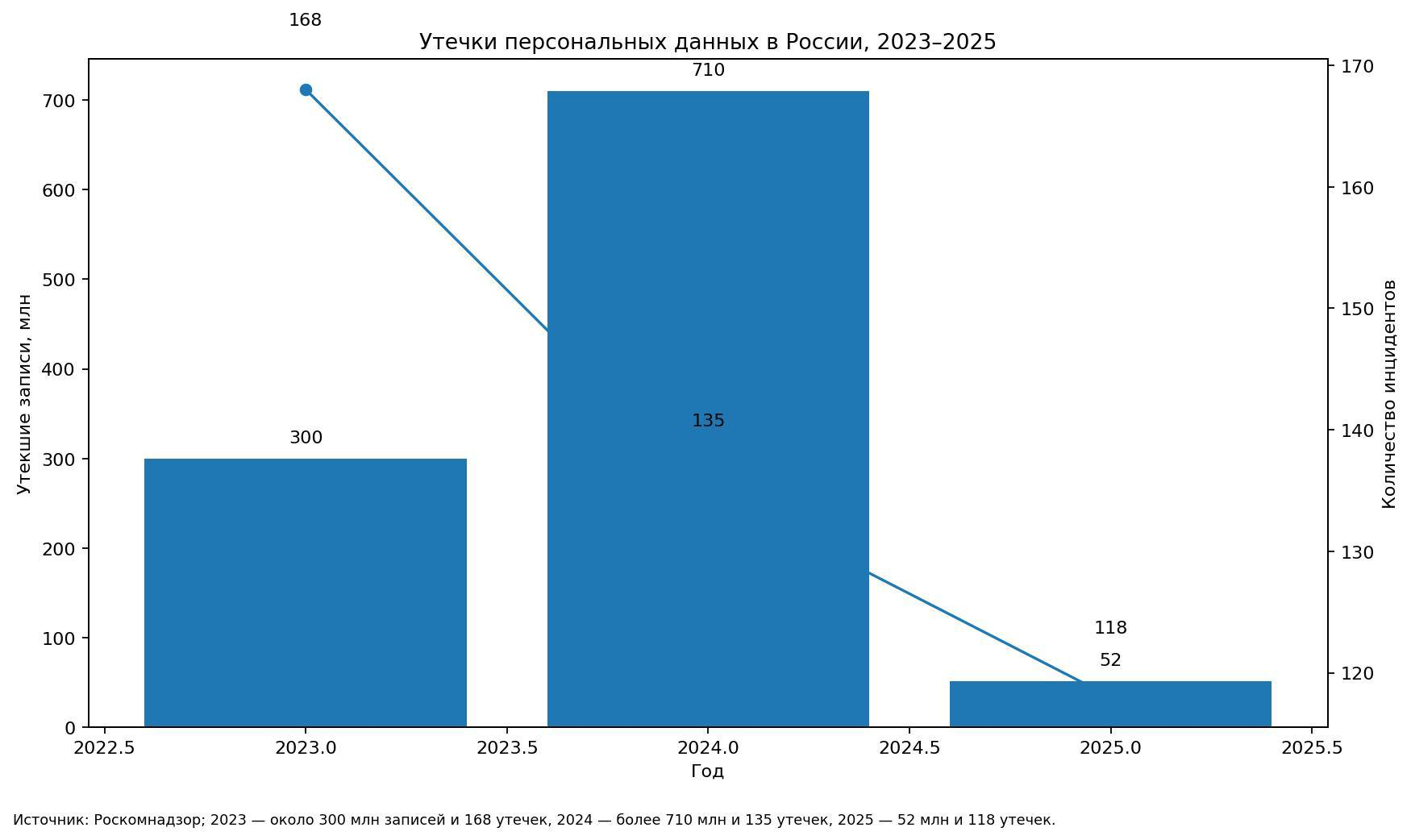 График показывает, как менялся масштаб утечек в России по годам: отдельно объем утекших записей и отдельно количество инцидентов. Он хорошо иллюстрирует важную мысль для статьи: число утечек и объем слитых данных не всегда растут синхронно. Бывает меньше инцидентов, но каждая утечка оказывается жирнее, потому что бизнес, как водится, любит складывать все яйца в один цифровой тазик.