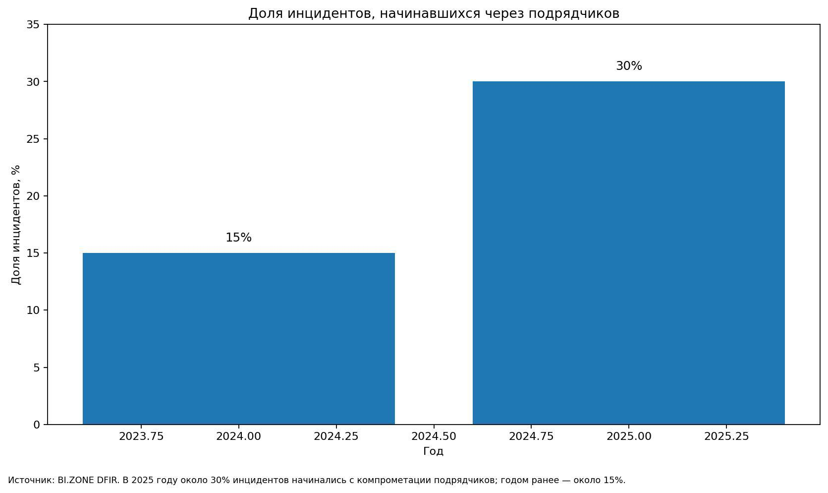 Если взломают подрядчика, данные могут утечь сразу из нескольких компаний. По данным BI.ZONE, около 30% инцидентов кибербезопасности начинаются именно через подрядчиков. Существенная часть киберинцидентов начинается через подрядчиков и внешние сервисы. Даже если основная компания защищена, уязвимость в CRM, сервисе рассылок или аутсорсинговом колл-центре может привести к утечке данных.График как раз показывает рост доли инцидентов, которые начинались через подрядчиков: около 15% в 2024 году и около 30% в 2025 году.