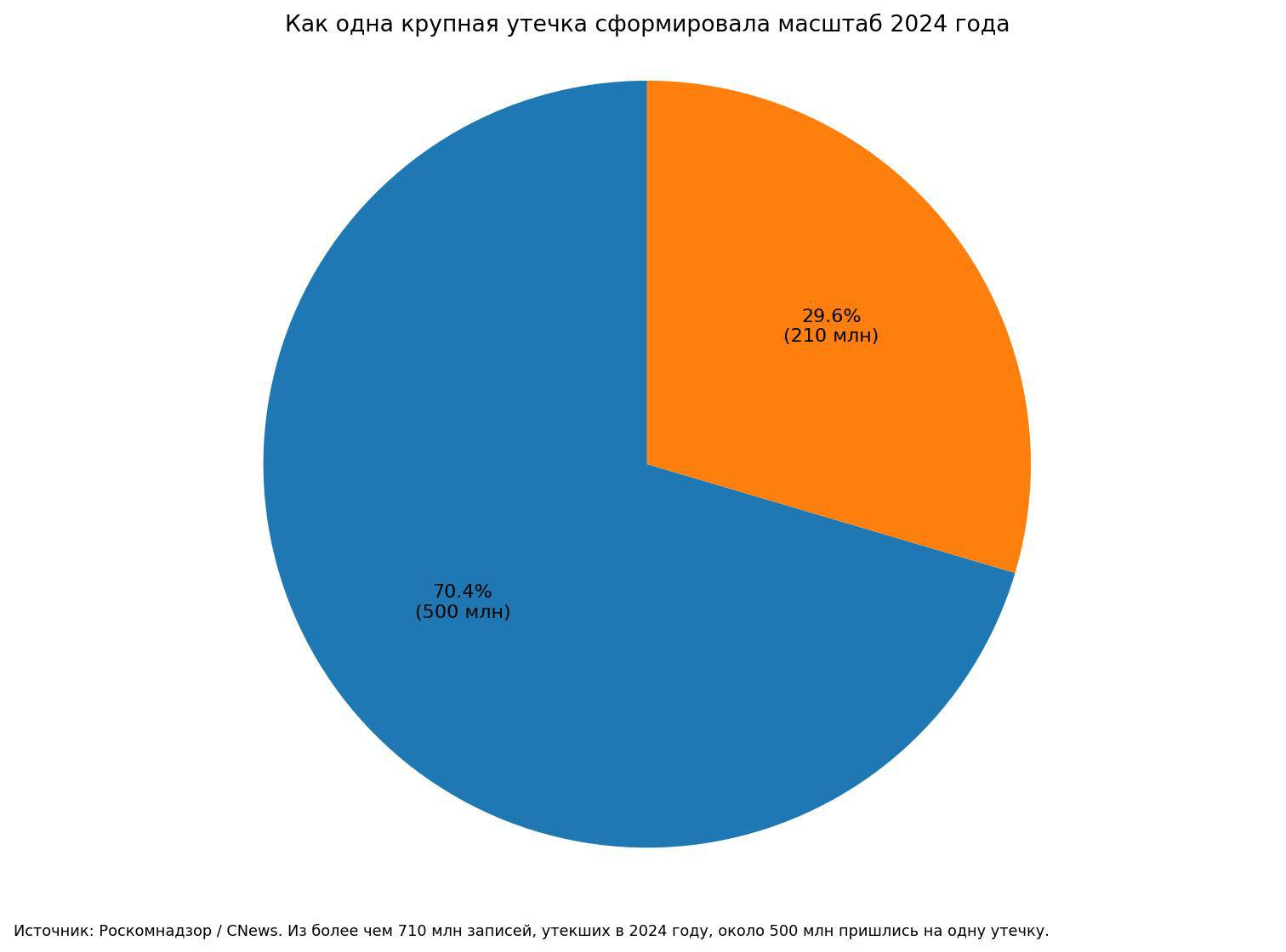 График показывает концентрацию ущерба в 2024 году: из более чем 710 млн записей около 500 млн пришлись на одну крупную утечку. Это сильный визуальный аргумент для текста о том, что рынок баз данных подпитывается не только множеством мелких инцидентов, но и редкими гигантскими сливами, которые одномоментно наполняют теневой рынок свежими массивами данных. Это показывает высокую концентрацию рисков.