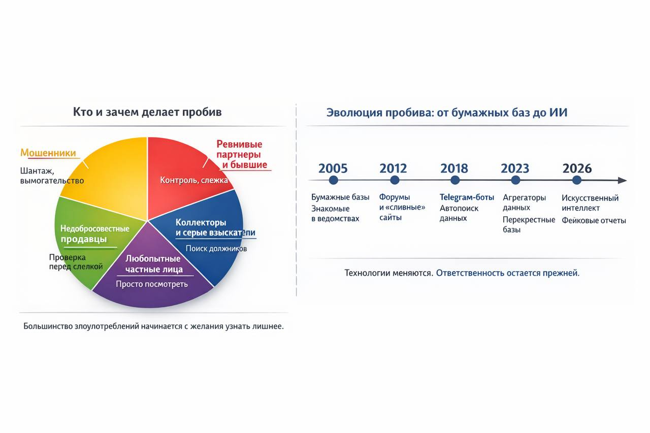 Часть данных действительно утекла в даркнет: базы ГИБДД, банков, коллекторов, страховых. Эти данные покупаются, «обновляются» и становятся основой сервисов. Подробнее: очередная утечка в частной медицине