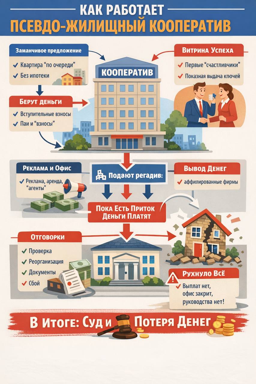 На первый взгляд — всё законно: вы платите вступительный взнос, ждёте несколько месяцев или лет, и вам обещают квартиру. Иногда участники действительно получают жильё — но только за счёт новых вкладов. Это и есть признак классической пирамиды. Как только поток новых людей сокращается — выплаты прекращаются, офисы закрываются, а деньги испаряются.