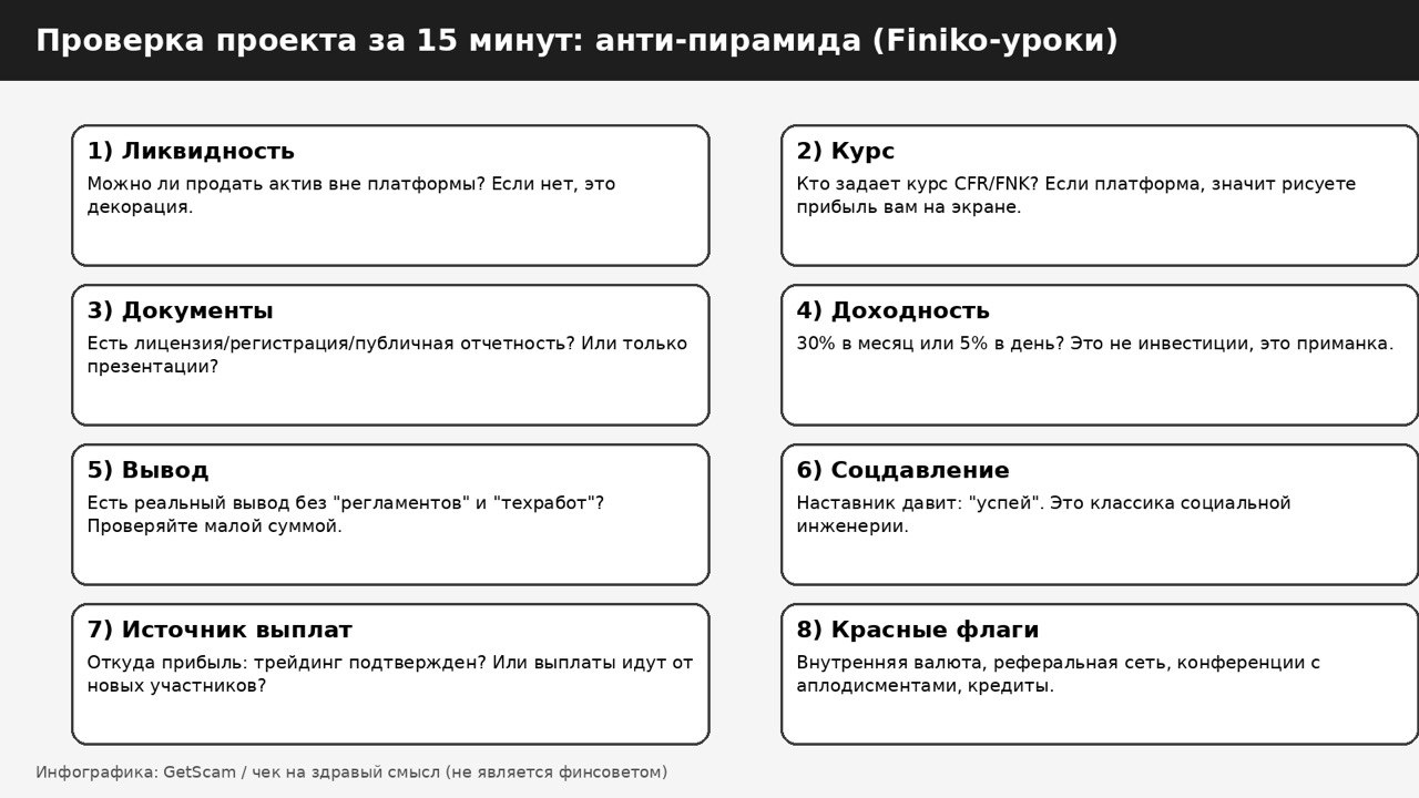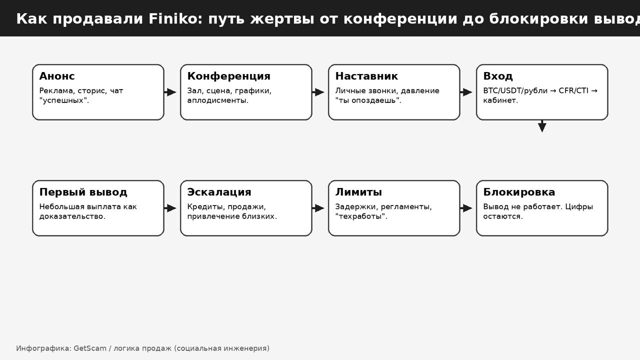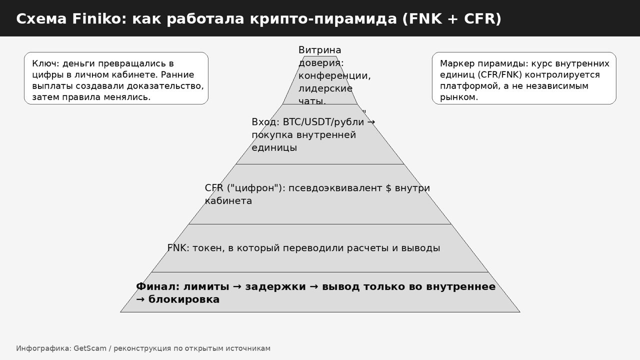 Название Finiko тоже было частью этой маскировки. У него нет официальной юридической расшифровки, это маркетинговый конструкт. Корень FIN отсылает к finance и fintech, а окончание -iko создает созвучие с ICO и международными стартапами. В итоге название звучало нейтрально и “технологично”, не вызывая защитной реакции. Вместе с аккуратным личным кабинетом, внутренними единицами CFR (как “эквивалент доллара”) и токеном FNK это формировало декорацию легального финансового сервиса. Именно поэтому многие адекватные люди верили не обещаниям, а внешнему виду системы.