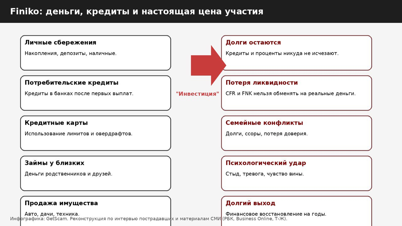 При этом в расследованиях РБК, Forbes и Business Online фигурируют оценки, что общий объем средств, прошедших через систему Finiko, мог составлять от 4 до 7 миллиардов рублей, с учетом не всех обратившихся и средств, выведенных на ранних этапах. Это не юридическая оценка, а журналистская аналитика масштаба.